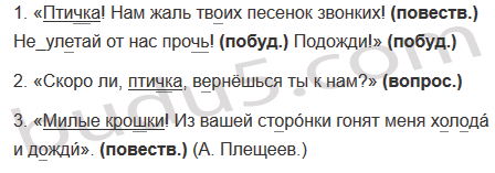 1. «Птичка! Нам жаль твоих песенок звонких! Не улетай от нас прочь! Подожди!» 2. «Скоро ли, птичка, вернёшься ты к нам?» 3. «Милые крошки! Из вашей сторонки гонят меня холода и дожди». (А. Плещеев.)