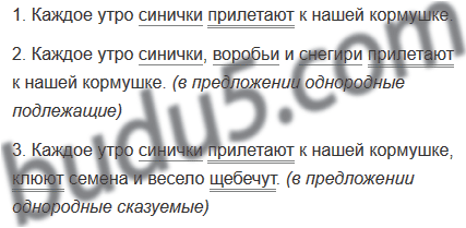 1. Каждое утро синички прилетают к нашей кормушке. 2. Каждое утро синички, воробьи и снегири прилетают к нашей кормушке. 3. Каждое утро синички прилетают к нашей кормушке, клюют семена и весело щебечут.