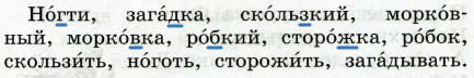 Но́гти, зага́дка, ско́льзкий, морко́вный, морко́вка, ро́бкий, сторо́жка, ро́бок, скользи́ть, но́готь, сторожи́ть, зага́дывать.