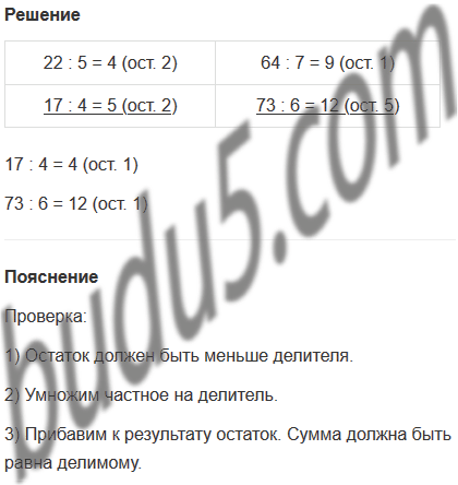 | 17 : 4 = 5 (ост. 2) | 73 : 6 = 12 (ост. 5) |