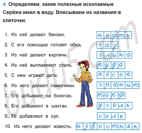 4. Учительница попросила Серёжу рассказать о полезных ископаемых. Но он смог о каждом сказать только одно предложение. Догадайся, какие полезные ископаемые он имел в виду. Впиши их названия в клеточки.