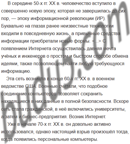 В середине 50-х гг. XX в. человечество вступило в совершенно новую эпоху, которая не завершилась до сих пор, — эпоху информационной революции (ИР). Буквально на глазах ранее неизвестные технологии входили в повседневную жизнь, а привычные средства информации приобретали новые формы. <...> С появлением Интернета осуществилась давняя мечта учёных и инженеров о простом и быстром способе обмена идеями, также позволяющем найти любую требующуюся информацию.