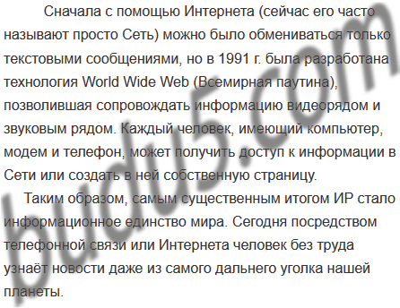 Сначала с помощью Интернета (сейчас его часто называют просто Сеть) можно было обмениваться только текстовыми сообщениями, но в 1991 г. была разработана технология World Wide Web (Всемирная паутина), позволившая сопровождать информацию видеорядом и звуковым рядом. Каждый человек, имеющий компьютер, модем и телефон, может получить доступ к информации в Сети или создать в ней собственную страницу.