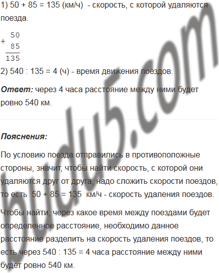 С одной и той же станции в одно и то же время вышли в противоположных направлениях два поезда. Скорость одного поезда 50 км/ч, а скорость другого 85 км/ч. Через какое время расстояние между ними будет ровно 540 км?