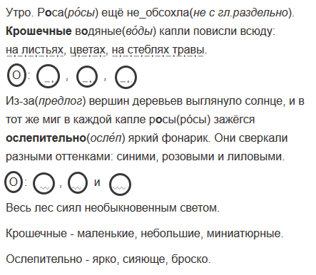 (Из) за вершин деревьев выглянуло солнце, и в тот же миг в каждой капле р..сы зажёгся осл..пительно яркий фонарик. Они сверкали разными оттенками синими розовыми и лиловыми. Весь лес сиял необыкновенным светом. (По Г. Скребицкому)