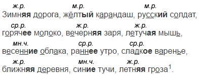 Зимн... дорога, жёлт... карандаш, русск... солдат, горяч... молоко, вечерн... заря, летуч... мышь, весенн... облака, ранн... утро, сладк... варенье, ближн... деревня, син... тучи, летн... гроза1.