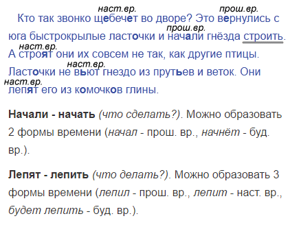 От глагола лепить можно образовать три временны́х формы, потому что он отвечает на вопрос что делать?, а глагол начать отвечает на вопрос что сделать?, поэтому от него нельзя образовать форму настоящего времени.